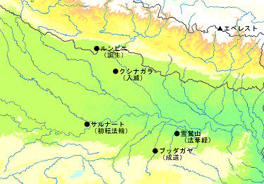 A ご誕生・・・・ルンビニ(世界遺産) B 成道・・・・・ブッダガヤ C 初転法輪・・・サルナート D 入滅・・・・・クシナガラ E 法華経・・・・霊鷲山 以上が五大仏跡 F 祇園精舎・・シュラーヴァスティー G 最後の途次・・バイシャリー 以上が七大仏跡 |